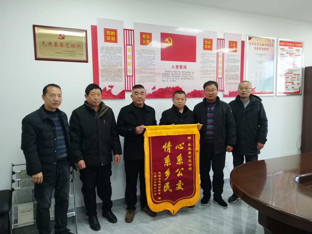 2025年11月25日上午,安徽省池州市東至縣花園鄉(xiāng)桃源村委會(huì)支書(shū)一行專程來(lái)到東至公共交通有限公司,將印有“心系公交 情系鄉(xiāng)民”的錦旗送給公司。感謝公司多年來(lái)開(kāi)行的縣城-桃源村公交車(chē),大大方便了桃源與外界互聯(lián)互通,也為沿線人民群眾的出行提供了便利。